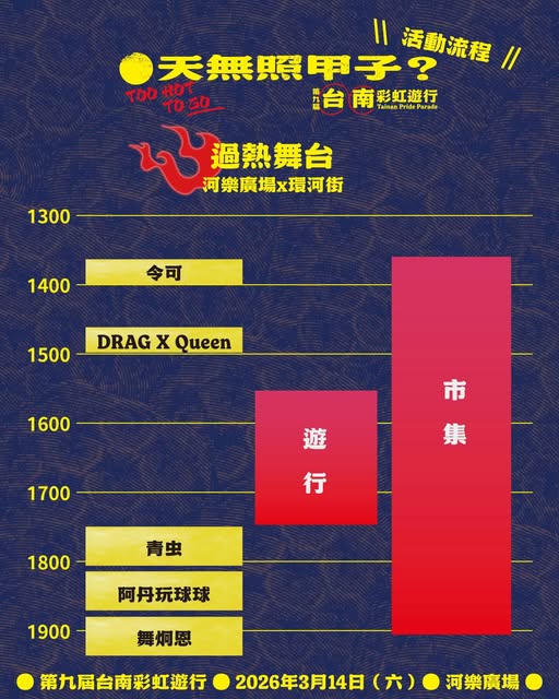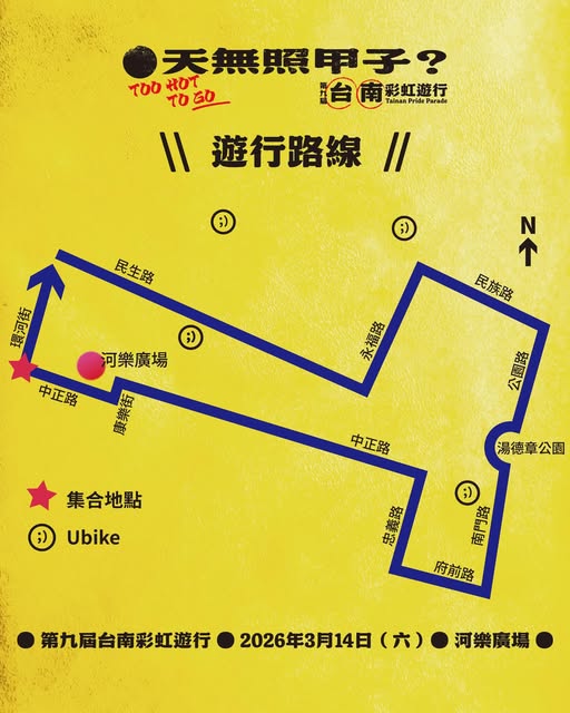 全台年度首場彩虹遊行115年3月14日(星期六)在台南市河樂廣場登場,今年第九屆台南彩虹以「天無照甲子」為命題,期盼引領社會一同反思家庭與關係的多元定義~